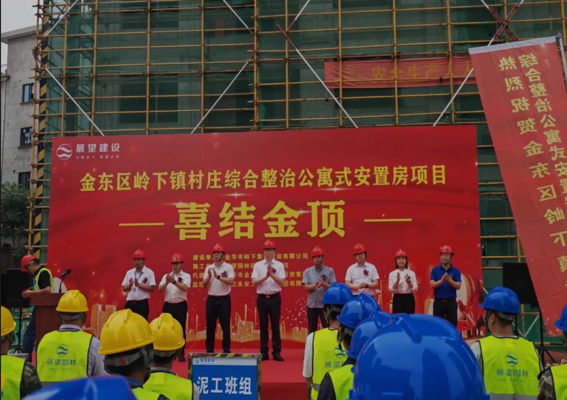 2023年6月13日上午,金东区岭下镇村庄综合整治公寓式安置房项目5幢高层全部封顶,浙江华杰工程咨询有限公司作为全过程造价咨询单位出席封顶仪式。董事长吴晓与金东区政府、区建设局、金东城投、岭下镇政府各级领导及各参建单位负责人一同见证这一重要时刻。