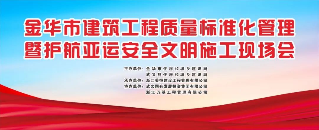 9月26日下午,由金华市住房和城乡建设局、武义县住房和城乡建设局主办,浙江姜恒建设工程管理有限公司承办,武义国有发展投资集团有限公司、浙江万基工程管理有限公司协办的金华市建筑工程质量标准化管理暨护航亚运安全文明施工现场会在后陈经验研学中心建设项目现场成功举办。