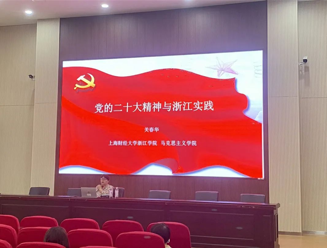 这次活动于2023年9月23日上午9点在上海财经大学浙江学院28-120报告厅举行,主题是《党的二十大精神与浙江实践》,主讲人关春华老师。