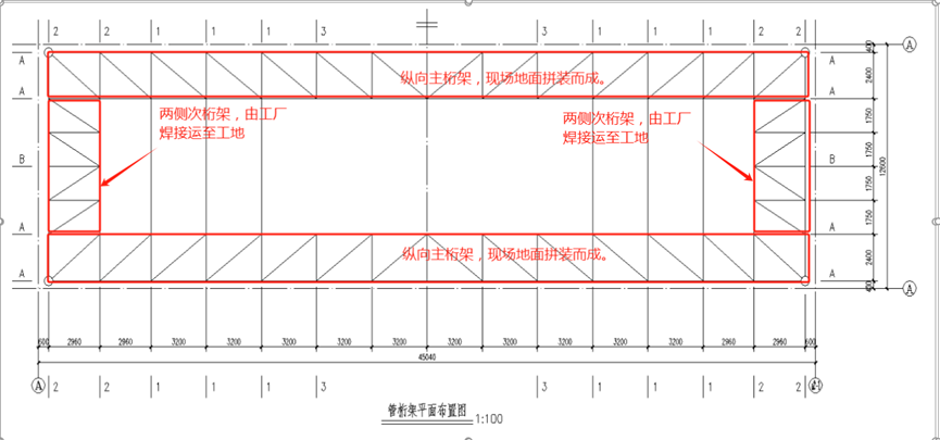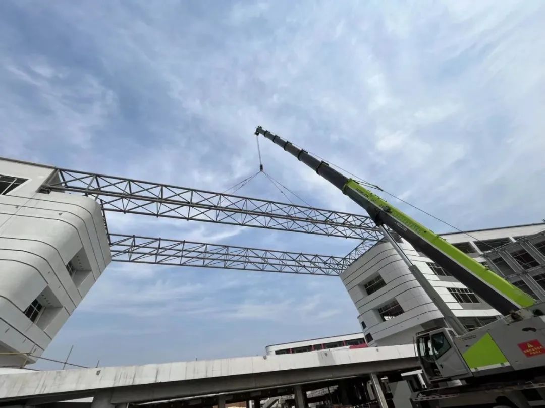 桁架进场安装,采用工厂焊接加工构件,运至现场在吊装前拼装焊接,纵向主桁架单榀跨度43.84米,重量21吨,(南北各一榀);两端次桁架单榀跨度7米重量2吨,桁架总重46吨。