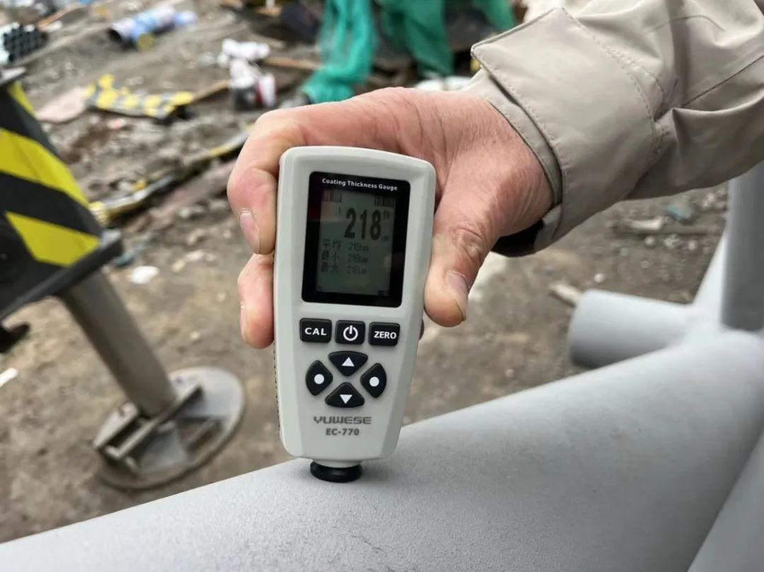 纵向主桁架采用现场拼接桁架:由三段桁架构件(工厂加工完成)拼接焊接而成。现场拼接完成进行探伤检测,进行防锈处理后检测漆膜厚度。
