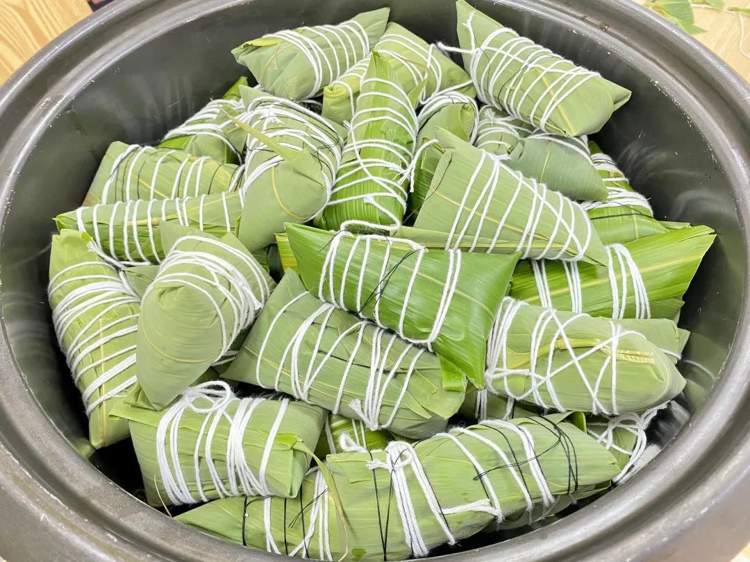 活动开始,粽叶、糯米、五花肉、细绳等材料被整齐摆放在桌上,大家便开始包粽子迎端午。会包的做示范,不会包的现学现做,不一会,一个个芳香四溢的粽子就出现在我们眼前。大家一边包一边交流心得,期间欢声笑语不断,很快桌子上就摆满了各式各样的粽子。