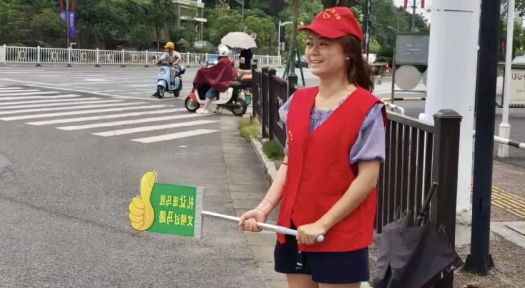 她们身着红马甲,头戴志愿者小红帽,手拿指示牌站在斑马线旁,耐心劝导非机动车不闯红灯、不越线、不逆向行驶;礼貌劝导行人不闯红灯、不乱穿马路,积极宣传倡导安全出行,宣传交通法律法规知识和安全驾驶、文明出行常识,配合公安交警做好督查工作。