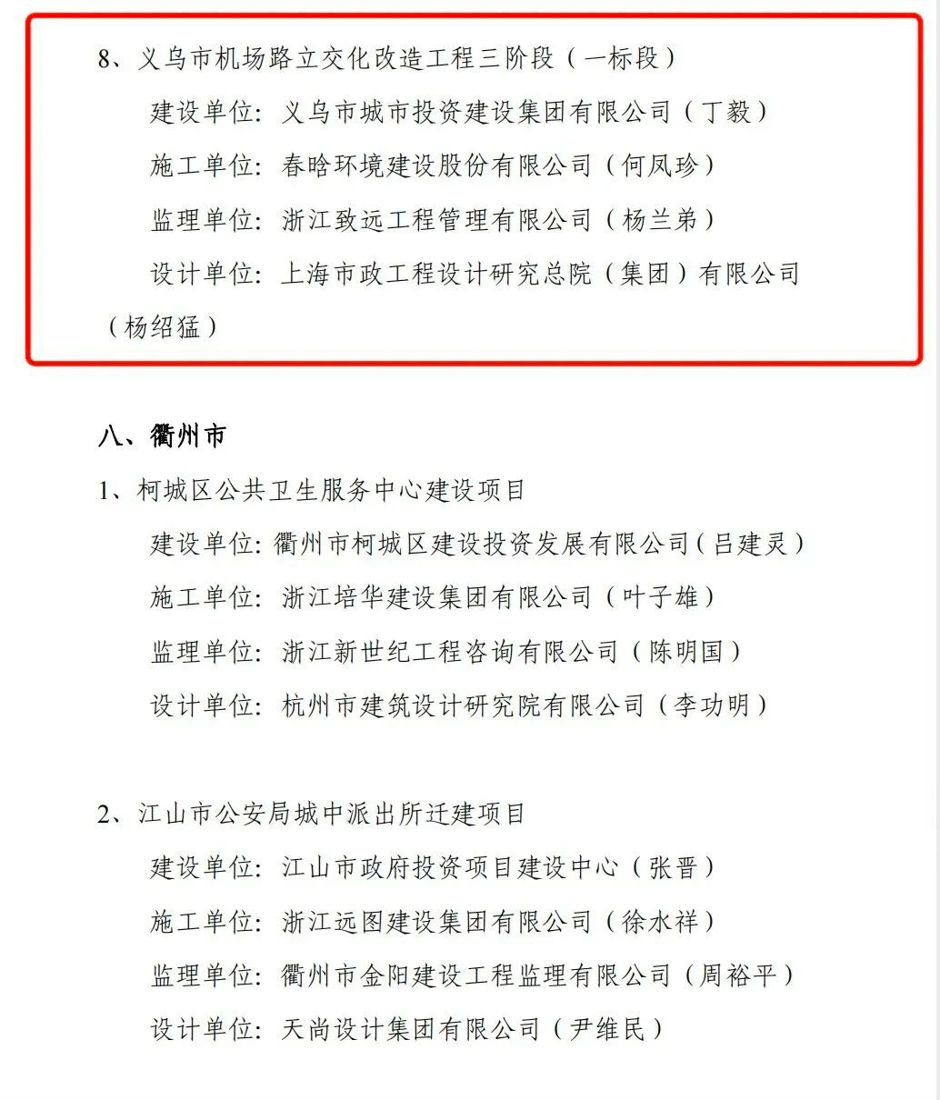 近日,由春晗环境建设股份有限公司承建施工的义乌市立交化改造工程三阶段一标获评2022 年度浙江省房屋建筑和市政基础设施工程“优秀平安工地”,全金华共2项市政工程项目入选,也是义乌市政工程线唯一入选项目。