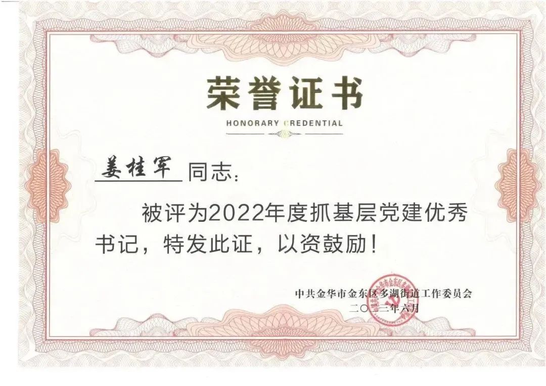 近日,双圆建管党支部书记、董事长姜桂军同志被金东区多湖街道授予“2022年度抓基层党建优秀书记”荣誉称号。