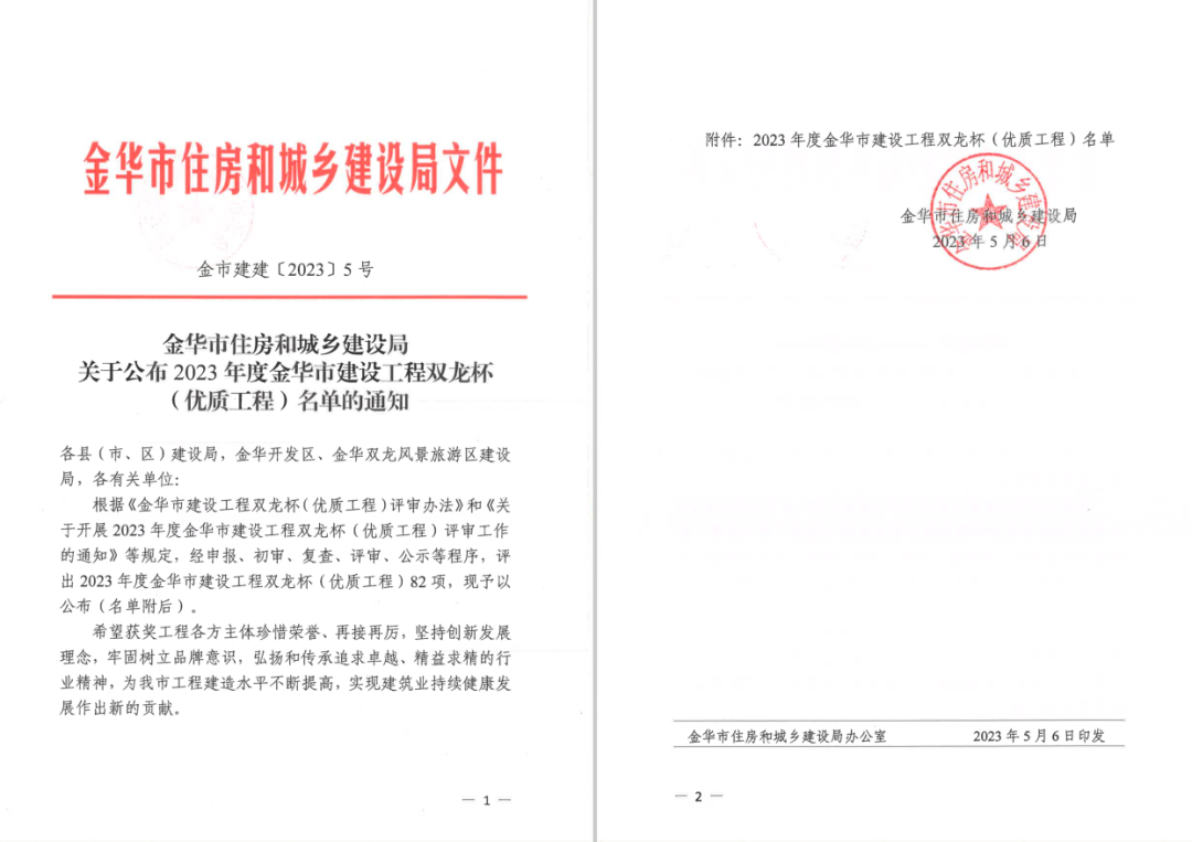 【浙江万基】我公司9个项目荣获2023年度金华市建设工程“双龙杯”优质工程奖